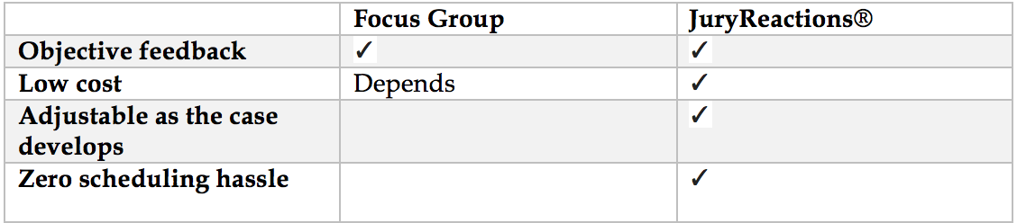 When deciding what research format to use, it is important to consider what type of information you need to get and the stage of your case. If you simply need some qualitative information about a particular topic, a focus group may be your best option. However, if you need more accurate results or want to test your entire case, consider a Private Jury Trial. If you are at the beginning stages of your case or are working with a limited budget, online jury research such as JuryReactions® is likely your best option. Regardless, remember to pick a service that will provide you with as much objective feedback as possible so that you can strengthen your case.